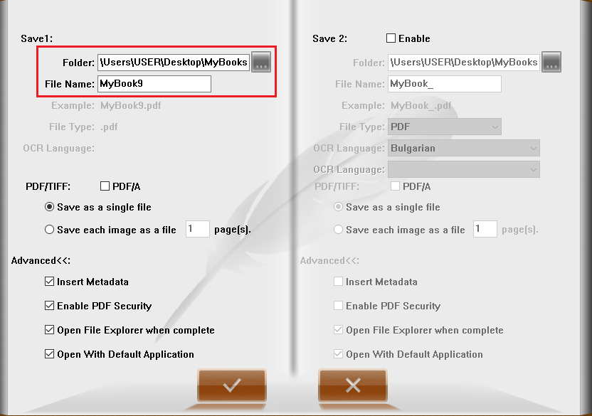 When you try to save the scanned files, you could modify file name and saving folder on top side of settings page.