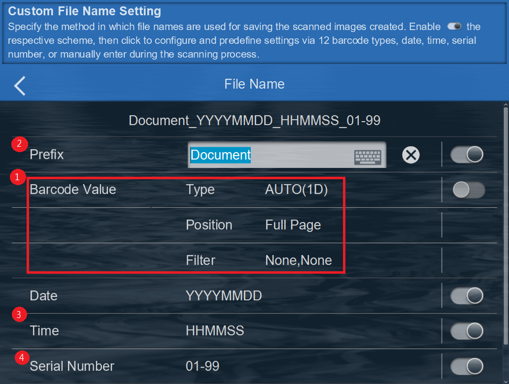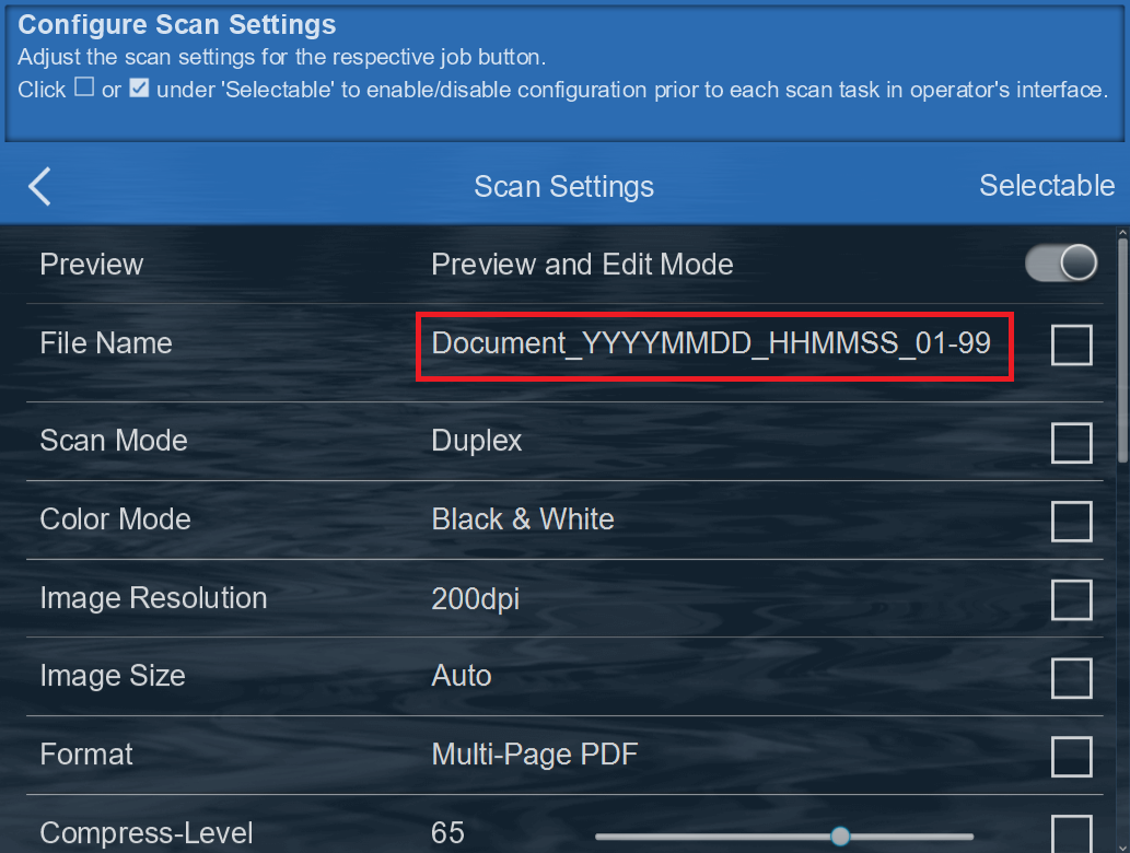 To apply an automatic naming scheme, simply right click on the individual job button/profile you wish to apply the modification to on the main menu > Click 'Scan Settings' > Click "File name"