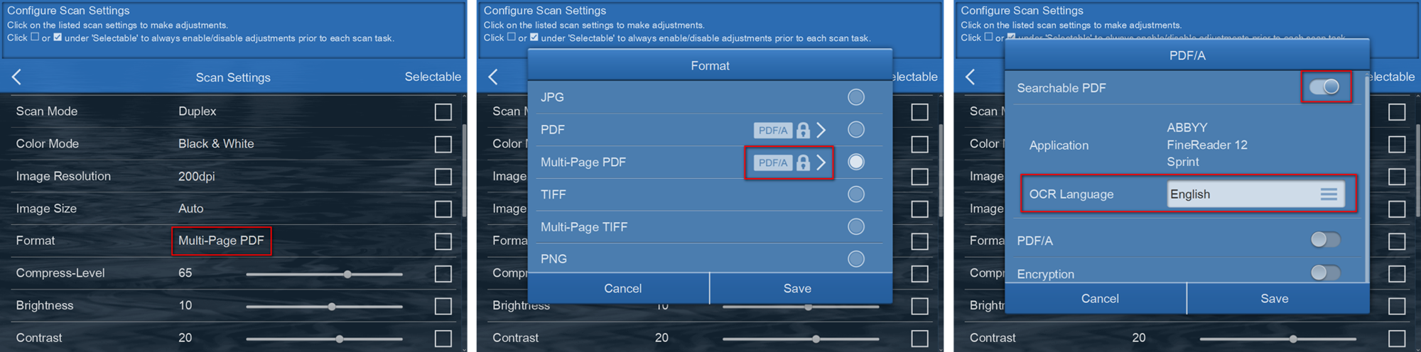 > enable 'Searchable PDF' > select the 'OCR Language' from the dropdown list.