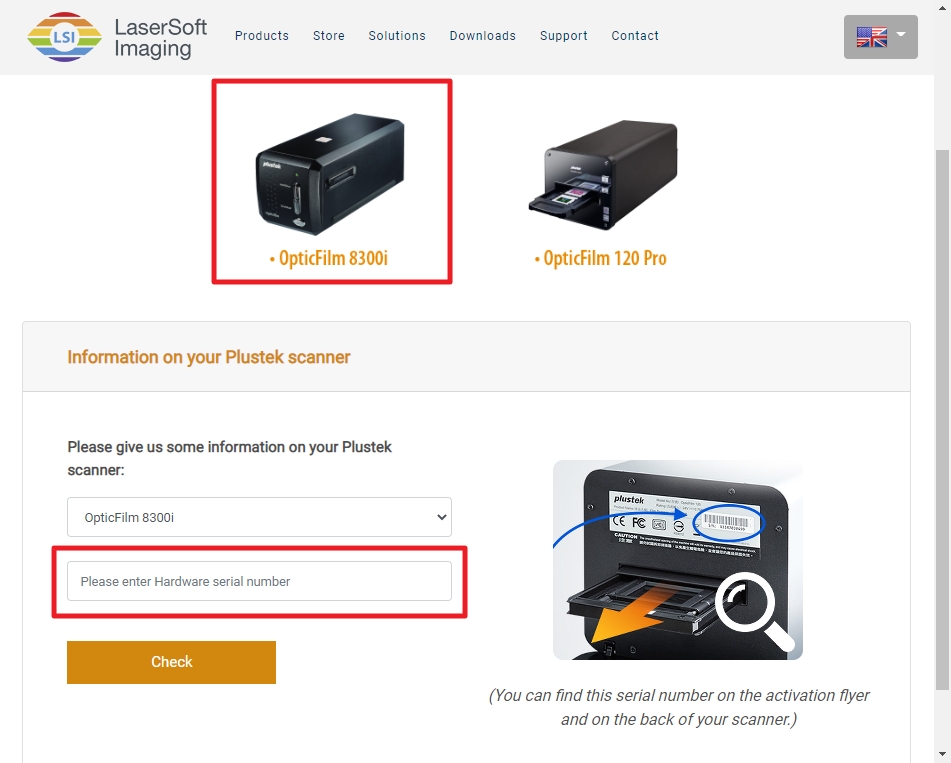 2. Please go to the SilverFast’s website to apply the unlocked serial number by typing the OpticFilm 8300i hardware serial number. https://www.silverfast.com/show/activation-plustek/en.html