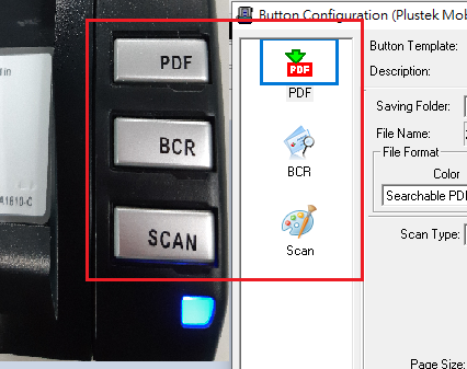 The three hardware buttons on the scanner are corresponding with the three utilities on the left-hand side of DocAction software.