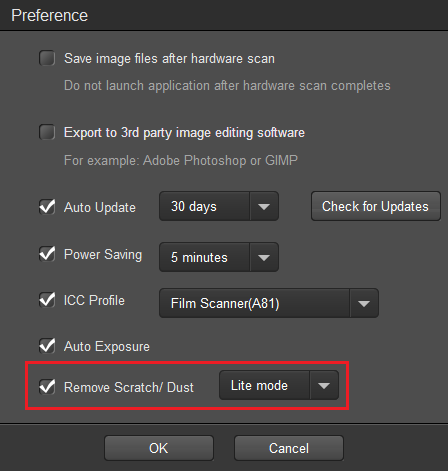 Please tick the checkbox front "remove scratch/dust" to activate this function under "Preference" interface .