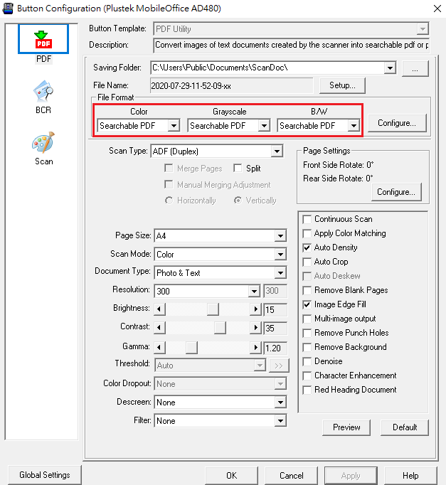 1. Choose "PDF" button and make sure the setting of "File format" is "Searchable PDF"