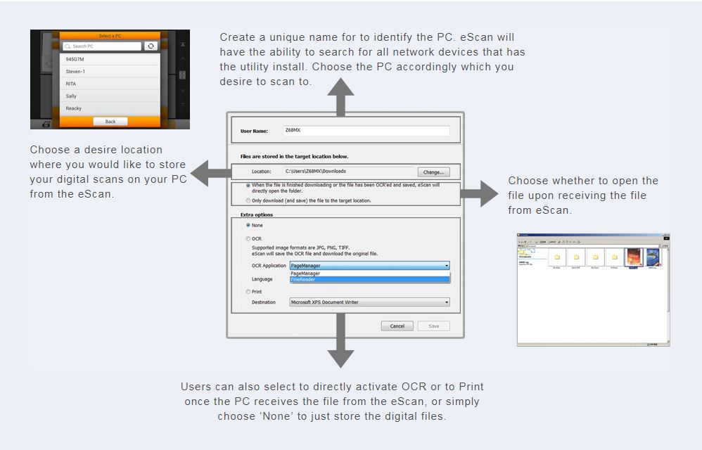 The eScan Client Utility for Windows and Mac is available on the eScan’s System Settings menu or can be downloaded from Plustek’s official website, under the drivers and downloads page. Install the utility on your computer to receive digital scan easily from the eScan.