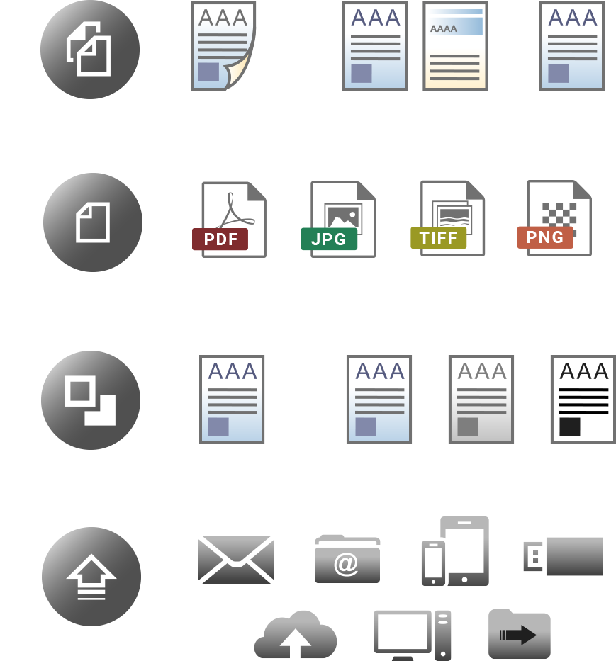 Load your document, tap a job button and your documents are sent to the destination. Create as many job groupings as you need.